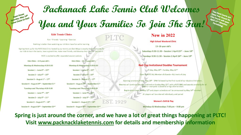 TENNIS CLUB UPDATE By packanacklake on March 23, 2022 • ( Leave a comment ) Share this: Click to share on X (Opens in new window) X Click to share on Facebook (Opens in new window) Facebook Click to email a link to a friend (Opens in new window) Email Click to share on Pinterest (Opens in new window) Pinterest Like Loading... Related Categories: Uncategorized packanacklake