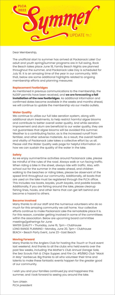 PLCA SUMMER UPDATE By packanacklake on June 8, 2022 • ( Leave a comment ) Share this: Click to share on X (Opens in new window) X Click to share on Facebook (Opens in new window) Facebook Click to email a link to a friend (Opens in new window) Email Click to share on Pinterest (Opens in new window) Pinterest Like Loading... Related Categories: Uncategorized packanacklake