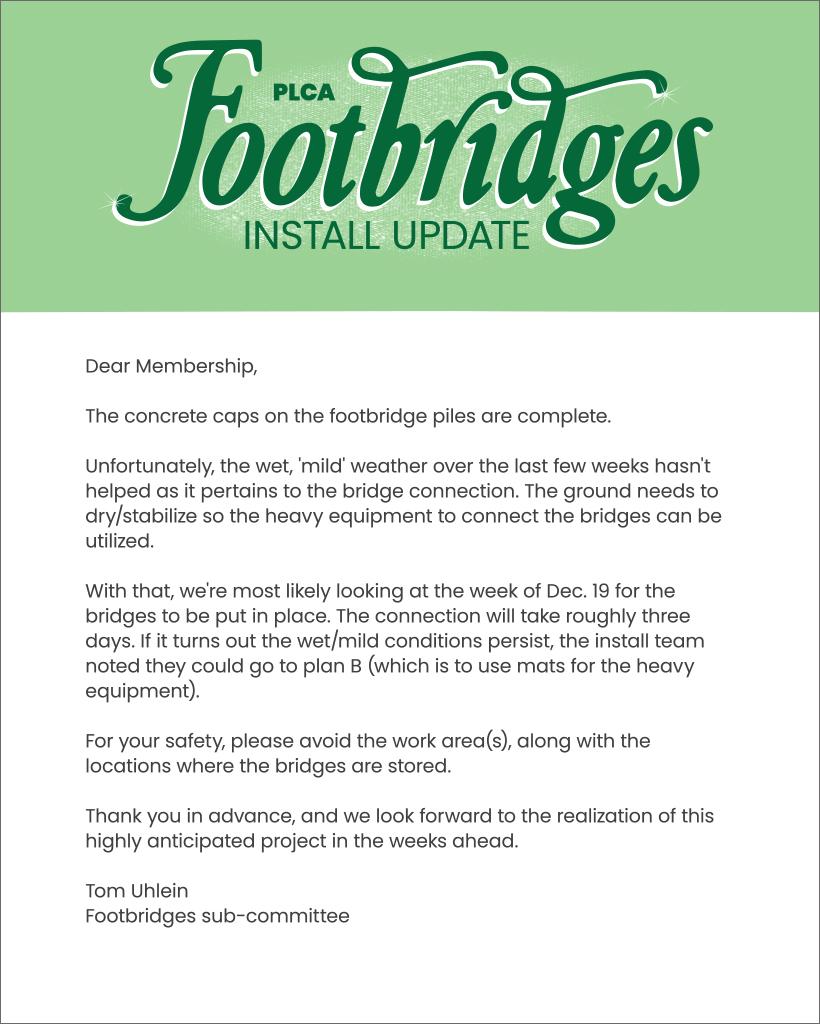 Footbridges Update 12/6/22 By packanacklake on December 6, 2022 • ( Leave a comment ) Share this: Share on X (Opens in new window) X Share on Facebook (Opens in new window) Facebook Email a link to a friend (Opens in new window) Email Share on Pinterest (Opens in new window) Pinterest Like Loading... Related Categories: Uncategorized packanacklake