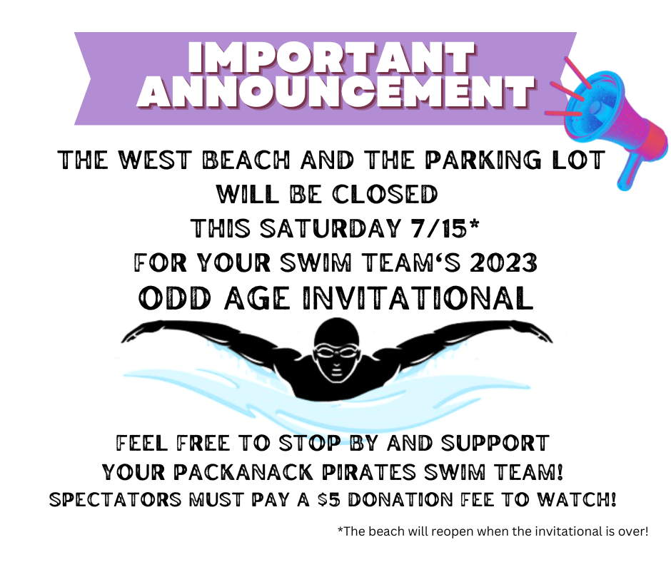 Tomorrow (Saturday, 7/15) our Packanack Pirates swim team have a big event. Please note that the West Beach and parking lot will be closed during the event. The West Beach will open after the meet. The East Beach will be open tomorrow from 12-6pm.