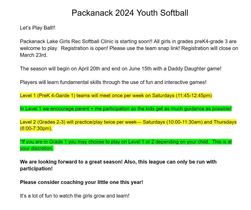 | Registration is now open for youth softball, tee-ball, and lacrosse! These spring programs offer a great introduction to each of their respective sports and will teach kids the fundamentals of the game while having a ton of fun! Softball is recommended for girls and offers two levels of play: Level 1 (Beginner) for Pre-K4 through 1st Grade, and Level 2 (Intermediate) for 1st-2nd graders. Level 1 teams will meet once per week on Saturdays (11:45-12:45pm), while Level 2 will practice/play twice per week— Saturdays (10:00-11:30am) and Thursdays (6:00-7:30pm). See the letter below from the commissioner for more information. Tee-ball is recommended for boys and runs for grades Pre-K3 to 2nd grade. Pre-K3 to K meets on Saturdays 9:00-10:00am and 1st and 2nd grades meet afterwards 10:15-11:15am. Lacrosse is co-ed and runs for grades Pre-K4 to 2nd grade. 1st and 2nd grade meet on Saturdays 9:00-10:00am and Pre-K and K meet afterwards 10:15-11:15am. If your child is unable to attend her/his age specific timeslot, the other will suffice, as both hours will be run similarly. Parents are encouraged to volunteer as coaches. The more parents that volunteer, the more the kids learn. Tee-ball and lacrosse both need commissioners this year for the leagues to run! If you sign up your child, please consider volunteering to be a commissioner. It is a tremendous help to the kids and community! Registration links are below. We hope to see you in April! Girls Youth Softball: Starts April 15 https://go.teamsnap.com/forms/415113 Lacrosse: Starts April 8 https://go.teamsnap.com/forms/415110 Boys Tee-Ball/Baseball: Starts April 8 https://go.teamsnap.com/forms/415115 |