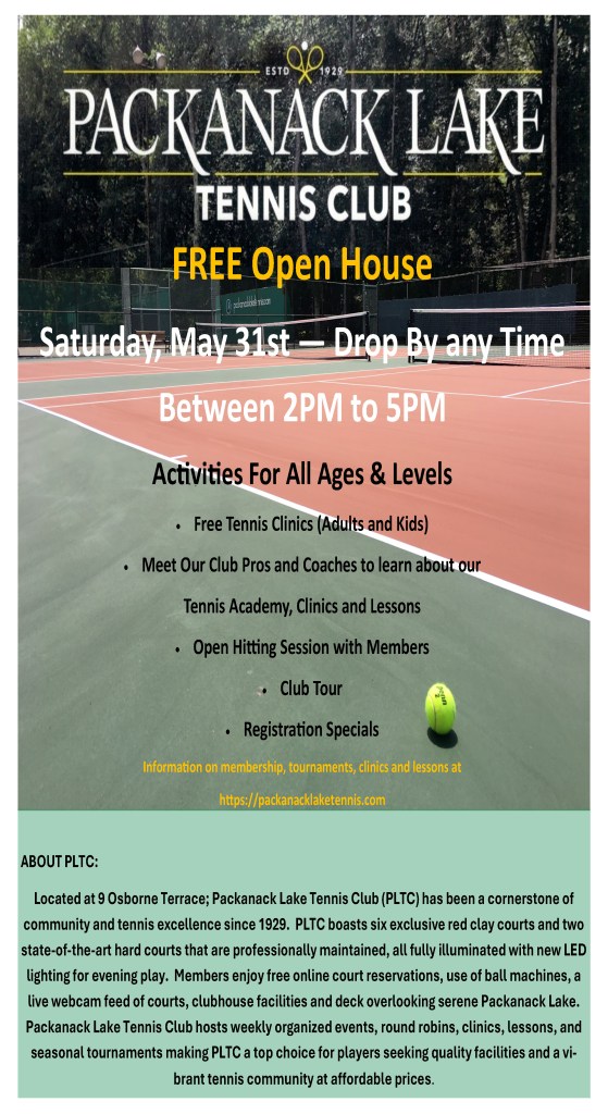 Tennis Club Open House is May 31 By packanacklake on May 6, 2025 • ( Leave a comment ) Share this: Share on X (Opens in new window) X Share on Facebook (Opens in new window) Facebook Email a link to a friend (Opens in new window) Email Share on Pinterest (Opens in new window) Pinterest Like Loading... Related Categories: Uncategorized packanacklake