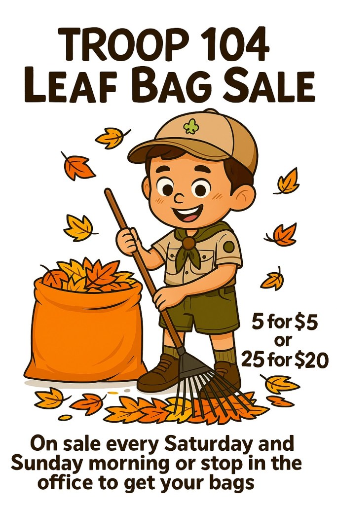 Troop 104 Leaf Bag Sale By packanacklake on October 21, 2025 • ( Leave a comment ) Share this: Click to share on X (Opens in new window) X Click to share on Facebook (Opens in new window) Facebook Click to email a link to a friend (Opens in new window) Email Click to share on Pinterest (Opens in new window) Pinterest Like Loading... Related Categories: Uncategorized packanacklake