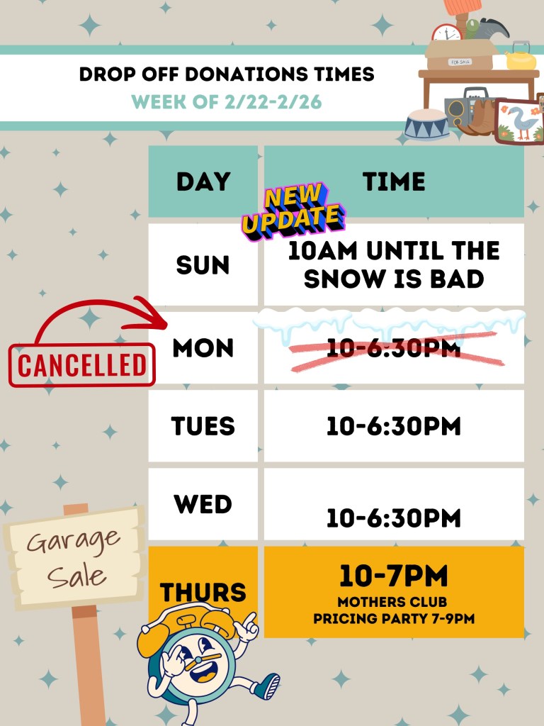 Garage Sale Donation Drop Off Hours By packanacklake on February 21, 2026 • ( Leave a comment ) Share this: Share on X (Opens in new window) X Share on Facebook (Opens in new window) Facebook Email a link to a friend (Opens in new window) Email Share on Pinterest (Opens in new window) Pinterest Like Loading... Related Categories: Uncategorized packanacklake